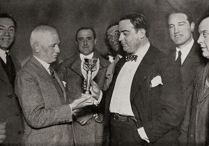 Jules Rimet presenting the World Cup trophy to Uruguay Federation President Raul Jude. Photographer Unknown, Public Domain From book “Album – Primer Campeonato Mundial de Football” (Argentine Football Association Library