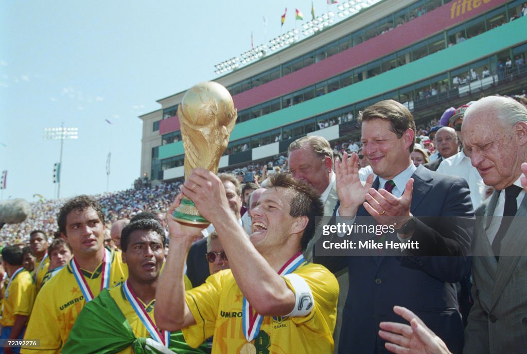 Brazilian Captain Dunga lifts the World Cup Trophy from Vice President Al Gore after defeating Italy (Photograph by Mike Hewitt, Getty Images)
