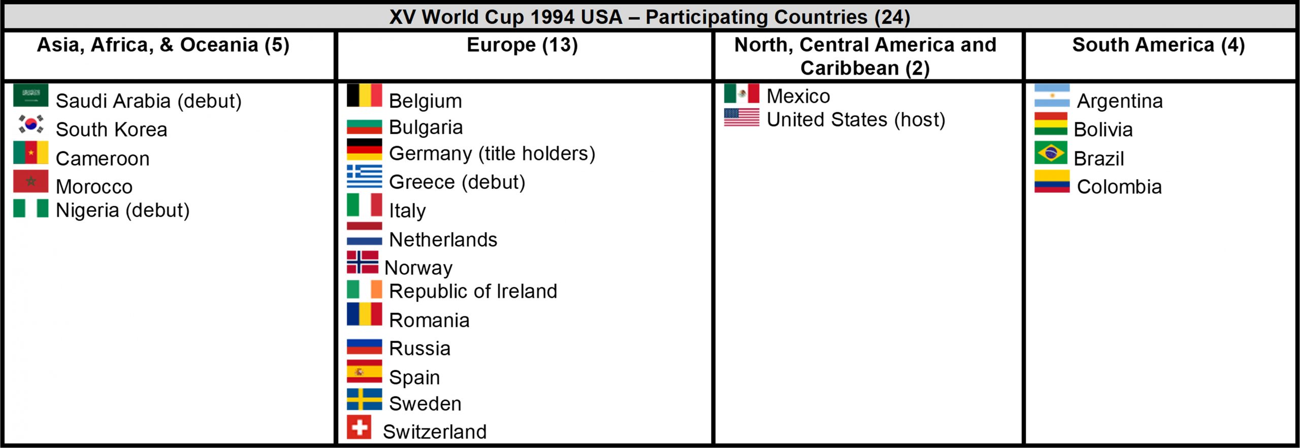 Three teams made their debut, one each from Asia, Africa, and Europe: Saudi Arabia, Nigeria, and Greece. But there were notable absences. Specifically: